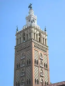When urban developer J.C. Nichols visited Seville, Spain in the 1920s, he was so impressed with the 12th-century Moorish tower of Giralda that he built a half-scale replica in the Country Club Plaza. The tower was officially christened by then-Seville mayor Felix Morena de la Cova, along with an official delegate[2] in 1967,[3] the same year in which the two cities became sister cities. The original Giralda tower was the minaret of the 12th century Muslim mosque; a Christian belfry was added in 1568.