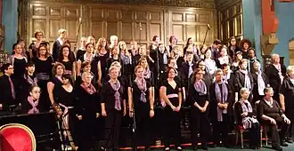 A women's choir or women's chorus is a choir formed exclusively by women. If all singers are young, it is called a girls' choir. The voice types are usually soprano and alto, SSAA. The names are also used for music especially composed for such groups.