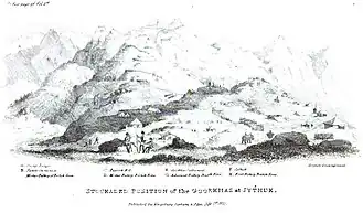 The experience at Nalapani so discomforted the British that Lord Hastings so far varied his plan of operations as to forego the detachment of a part of this division to occupy Gurhwal.[3] He accordingly instructed Colonel Mawbey to leave a few men in a strong position for the occupation of the Doon and to carry his undivided army against Amar Singh's son, Colonel Ranajor Singh Thapa, who was with about 2,300 elite of the Gurkha army, at Nahan.[3] It was further intended to reinforce the division considerably; and the command was handed over to Major-General Martindell.[3] In the meantime Colonel Mawbey had led back the division through the Keree pass, leaving Colonel Carpenter posted at Kalsee, at the north western extremity of the Doon.[4] This station commanded the passes of the Jumna on the main line of communication between the western and eastern portions of the Gurkha territory, and thus was well chosen for procuring intelligence.[4]