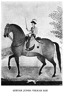 Girvan Yuddha Bikram Shah (Nepali: श्री ५ महाराजाधिराज गीर्वाणयुद्ध विक्रम शाह देव; 19 October 1797 – 20 November 1816) also called Girvanyuddha Bikrama Shah, was King of Nepal.[1] Although he was not the legitimate heir to the throne his father, King Rana Bahadur Shah, made him the heir for being the son of his favourite wife Kantavati Jha.