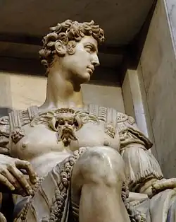 Giuliano's tomb in the Medici Chapel[3] of the Church of San Lorenzo, Florence, is ornamented with the Night and Day of Michelangelo, along with a statue of Giuliano by Michelangelo. He shares an identical common name (Giuliano de' Medici) with his uncle Giuliano di Piero de' Medici, whose tomb is also in the Medici Chapel and who is famous for having been assassinated in the Pazzi Conspiracy.