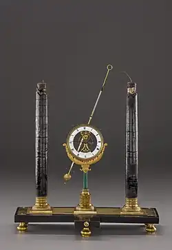 Zamboni was able to devise a pile that could move a light pendulum for a very long period of time. The pendulum was mounted between the oppositely charged poles of two piles placed side by side, and went into oscillation because of the alternating attraction and repulsion it experienced.[1] The description of this “electromotive perpetual pendulum” was published extensively after it appeared in Luigi Valentino Brugnatelli's Giornale di fisica in December 1812 and the following January.[1] In 1814 Zamboni modified the pendulum, creating one of the first electric clocks. In 1815 he presented his device to the Royal Society of London. Zamboni's instrument was described in the Royal Society's January 1815 report. The instrument is mentioned in a letter from Sir Joseph Banks to Francis Ronalds.[2] Ronalds visited Zamboni’s laboratory in Verona in 1820 during his Grand Tour, and again in 1858 where he admired a clock that had been running for fifteen years.[3]