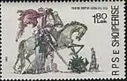 In Albanian folklore, Gjergj Elez Alia is regarded as a great warrior and his legend is one of the most popular. A song of Gjergj Elez Alia was recorded by Bernardin Palaj and Donat Kurti in Nikaj (Tropojë District) and published in Tirana in 1937.[27] The song is usually sung accompanied by the lahuta (gusle), or occasionally with çifteli, by the rapsod (performer of epic poetry).[28] The song of Gjergj Elez Alia is part of the heroic non-historical cycle of Albanian epic poetry, the Kângë Kreshnikësh ("Songs of Heroes"), however it is not related to the epic cycle of the pair of heroic brothers Muji and Halili.[29]