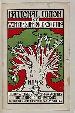 During the war, the organisation suspended political campaigning, running a series of lectures instead. In the advertisements, they identified themselves as "non-party, non-militant" and "law-abiding", in order to distinguish themselves from the more militant groups, such as the Women's Social and Political Union.[15][16]