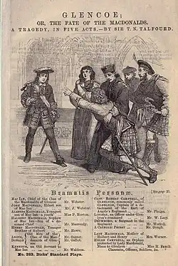 Glencoe; or, the Fate of the Macdonalds is a historical tragedy by the British writer Thomas Talfourd.[1] It premiered at the Theatre Royal, Haymarket on 23 June 1840.[2] The cast included William Macready as Halbert MacDonald, Helena Faucit as Helen Campbell, Henry Howe as Henry MacDonald, Benjamin Webster as MacIan, Samuel Phelps as Captain Robert Campbell, Priscilla Horton as Alaster MacDonald, Walter Lacy as Lindsay and Mary Warner as Lady MacDonald. Talfourd dedicated the published version to the literary critic Lord Jeffrey. It was revived at the Surrey Theatre in October 1849.[3]