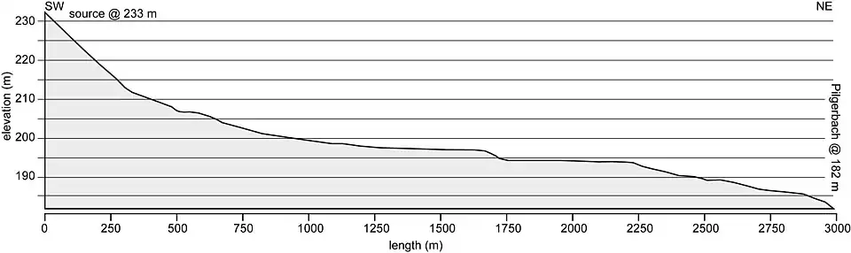 The Glisborn spring is situated 650 metres (2,130 ft) m north of the summit of the Odenberg hill and 1,100 metres (3,600 ft) northwest of Scharfenstein hill, at an elevation of 233 metres (764 ft). The spring water flows directly in to a large pool (see photo) before emptying into the stream. Its very short course of 3 kilometres (1.9 mi) flows through arable land and then into the Pilgerbach stream near Edermünde-Holzhausen at an elevation of 182 metres (597 ft). This gives an average gradient of 1.7%.