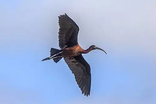 This species is a mid-sized ibis. It is 48–66 cm (19–26 in) long, averaging around 59.4 cm (23.4 in) with an 80–105 cm (31–41 in) wingspan.[20][21] The culmen measures 9.7 to 14.4 cm (3.8 to 5.7 in) in length, each wing measures 24.8–30.6 cm (9.8–12.0 in), the tail is 9–11.2 cm (3.5–4.4 in) and the tarsus measures 6.8–11.3 cm (2.7–4.4 in).[21] The body mass of this ibis can range from 485 to 970 g (1.069 to 2.138 lb).[21] Breeding adults have reddish-brown bodies and shiny bottle-green wings. Non-breeders and juveniles have duller bodies. This species has a brownish bill, dark facial skin bordered above and below in blue-gray (non-breeding) to cobalt blue (breeding), and red-brown legs. Unlike herons, ibises fly with necks outstretched, their flight being graceful and often in V formation. It also has shiny feathers.