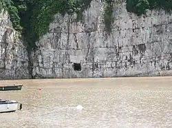 The small square opening leads into a much larger chamber within the cliffs. The entrance is about 5 feet 6 inches (1.7 m) square, and runs in for about 12 feet (3.7 m). The cave was a natural opening in the limestone which was enlarged so that its greatest depth and greatest breadth are 27 feet (8.2 m), and its height at one point is 15 feet (4.6 m).[1] There is speculation about its origin and about what it has been used for in the past. Suggestions include its use by the Shirenewton Quakers for storing tea, or for the storing of explosives by Brunel when the railway was built. A local antiquarian, J.G. Wood, wrote in 1901 that nearly 50 years earlier he had quizzed the oldest inhabitants and discovered that this natural cave had been enlarged and fitted with a crane at its mouth to unload large ships that could moor there in deep water, but could not easily dock at the shallower wharves on the Chepstow side of the river. The cargo was then reloaded onto trows and taken up river to Monmouth and Hereford. For many years mooring chains and rings in the cliff below survived to support this explanation.[2] The cave can only be reached by boat at high tide.[1]
