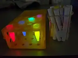 {{cite journal}}: CS1 maint: multiple names: authors list (link) - ^ a b Thomas S. Kuntzleman, Kasey R. Bunker, Ashlee A. Bartlett (2019). "Simple Glowmatography: Chromatographic Separation of Glow-Stick Dyes Using Chalk". Journal of Chemical Education. 96 (7): 1506–1509. Bibcode:2019JChEd..96.1506K. doi:10.1021/acs.jchemed.8b00237. S2CID 104376017.