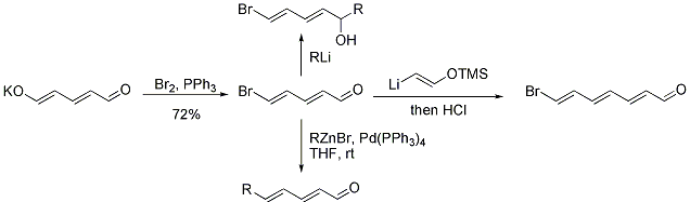 - ^ Vicart, N.; Castet-Caillabet, D.; Ramondenc, Y.; Ple, G.; Duhamel, L. (1998). "Application of (2E,4E)-5-Bromo-2,4-Pentadienal in Palladium Catalysed Cross-Coupling: Easy Access to (2E,4E)-2,4-Dienals". Synlett (4): 411–412. doi:10.1055/s-1998-1672.