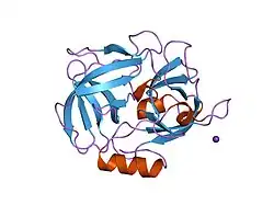 5. ^ Filipek R, Rzychon M, Oleksy A, Gruca M, Dubin A, Potempa J, Bochtler M (October 2003). "The Staphostatin-staphopain complex: a forward binding inhibitor in complex with its target cysteine protease". The Journal of Biological Chemistry. 278 (42): 40959–40966. doi:10.1074/jbc.M302926200. PMID 12874290.