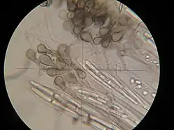 The spores are smooth and cylindrical, sometimes with a slight swelling in the middle, and sometimes slightly curved; they measure 59–65 by 4–5 μm. G. glutinosum spores have between two and seven septa, although three is most typical in mature specimens. The thin-walled asci (spore-bearing cells) are cylindrical to narrowly club-shaped, eight-spored, and typically measure 200–265 μm long by 12–16 μm wide. Ascospores occupy about the upper two-thirds to three-quarters of the ascus, leaving a hyaline (transparent) base. The paraphyses, hyaline at the base and brown in the upper regions, are 4–11 μm wide,[3] and longer than the asci. Cells at the end of the paraphyses are pear-shaped (piriform) or spherical, brownish, and measure 8–10 μm wide.[17] The sticky material on the stipe is a gelatinous matrix made of a layer of paraphyses.[6]