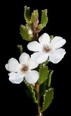 The flowers are arranged singly or sometimes in pairs in the axils of leaves on a stalk 2–4 millimetres (0.08–0.2 in) long . There are 5 narrow, pointed sepals which have similar glands to the branches and leaves. There are also 5 petals joined at their bases, forming a bell-shaped tube. The petal tube is white apart from inside the tube and the lower lobe which are white with yellow blotches. The tube is 4–7 millimetres (0.2–0.3 in) long with lobes of slightly different lengths. There are 4 short stamens which extend slightly beyond the petal tube. Flowering occurs throughout the year, especially after rain and is followed by fruits which are dry and winged when mature.[2][3]