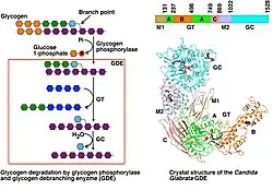 The structure of the Candida glabrata GDE has been reported.[25] The structure revealed that distinct domains in GDE encode the glucanotransferase and glucosidase activities. Their catalyses are similar to that of alpha-amylase and glucoamylase, respectively. Their active sites are selective towards the respective substrates, ensuring proper activation of GDE. Besides the active sites GDE have additional binding sites for glycogen, which are important for its recruitment to glycogen. Mapping the disease-causing mutations onto the GDE structure provided insights into glycogen storage disease type III.
