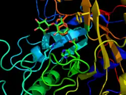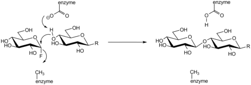 The term glycosynthase refers to a class of proteins that have been engineered to catalyze the formation of a glycosidic bond. Glycosynthase are derived from glycosidase enzymes, which catalyze the hydrolysis of glycosidic bonds.[2] They were traditionally formed from retaining glycosidase by mutating the active site nucleophilic amino acid (usually an aspartate or glutamate) to a small non-nucleophilic amino acid (usually alanine or glycine). More modern approaches use directed evolution to screen for amino acid substitutions that enhance glycosynthase activity.[3]
