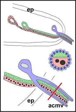 Another important synapomorphy of the group is the duo-glandular adhesive system. It is a structure of the epidermis containing three different cell types: anchor cells, adhesive glands and releasing glands. The adhesive glands secrete an adhesive substance that attaches the anchor cells to a surface, while the releasing glands secrete a substance able to release the anchor cells from surfaces.[1] This systems allows rhabditophorans to adhere and release quickly from the substrate, even several times in a second.[3]