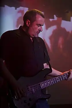 After Godflesh's dissolution, Broadrick and Green rarely spoke.[99] Though there was no falling out between the two members, Broadrick assumed the project permanently dead, believing that Green's interest in it was gone.[99][100] Regardless, Broadrick decided in 2009 to approach Green with an offer to reform, something that promoters had been pushing for years.[100] Green responded to Broadrick's call within a few hours, saying he would love to do it.[99] Both members quickly agreed that the most important thing for the reunion's integrity was that they return to a drum machine for percussion.[100] In November 2009, the reunion was made public when Godflesh announced they would perform at the 2010 edition of the Hellfest Summer Open Air in Clisson, France.[101] Asked in a February 2010 interview about Godflesh's future, Broadrick replied, "Godflesh will not commit to anything but Hellfest currently. I am unsure as to where we will go from there, if we go anywhere at all."[102] He also revealed that the likelihood of new material was "fairly minimal", but that the possibility still existed;[102] though later, in 2014, he insisted that "ultimately, the whole reformation thing was pretty much fundamentally about wanting to make new music".[78] On 18 June 2010, Godflesh performed for their first time since 2001 at Hellfest. The show was fraught with technical difficulties, ending up as a forty-minute set instead of the intended sixty minutes.[103] Despite the frustration of the return performance, Godflesh continued to play festivals throughout 2010 and 2011,[104] including the 2011 edition of the Roadburn festival in Tilburg, Netherlands, where they performed their first album, Streetcleaner, in its entirety.[105] This performance was later released as the group's first live album in 2013.[106]