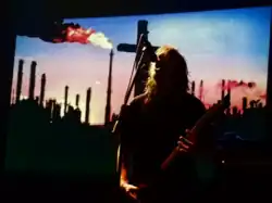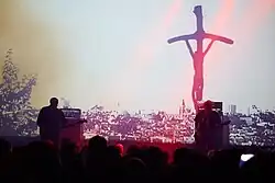 The band's stage show is, like their music, minimal and focused.[210] Godflesh only occasionally employ a smoke machine, and the lights are generally static;[216] Toby Cook of The Quietus highlighted this unusual approach in a review of a 2014 concert, writing, "Over-lit and with no dry ice in sight, they look alarmingly exposed".[216] Images of industrial urban sprawls, Christian iconography and apocalyptic landscapes cycle through the projector.[199] The music itself is presented as noisy and overwhelming, with some critics calling the sound even more cacophonous and dissonant than the band's studio work.[211][106][217] Gaps between songs are normally filled with feedback, and the band rarely speak to the crowd.[154][218][219] In response to a question about Godflesh's laconic stage presence, Broadrick said, "I don't communicate with people. We just make music. We come on stage and I don't say anything to anyone. And that alone made people really mad. I find it really bizarre. I can't believe that people would disown a band because I'm not telling them how much I'm going to kick their asses tonight."[86]