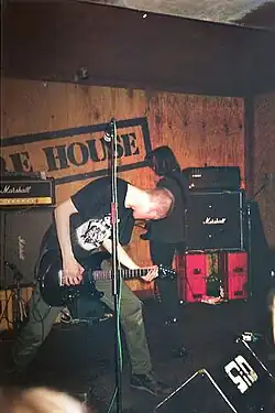 Godflesh's sound is characterised by a combination of programmed drum machine beats, percussive bass and distorted heavy metal guitar.[17][93] Though the band would later employ human drumming for Songs of Love and Hate and Hymns in 1996 and 2001 respectively (a decision that Broadrick believed compromised the group's musical identity),[99] Godflesh's early sound was dominated by artificial, stiff drum loops and an uncommon focus on bass.[21][99] On those early influential releases, the rhythms, synths and samples were credited to "Machine" or "Machines" despite being done by Broadrick. Initially, the employment of mechanical percussion was done out of necessity.[168][169] When Broadrick rejoined Fall of Because with Green to form Godflesh, the beats he desired were too difficult to play acoustically, so he instead used an Alesis HR-16 drum machine;[8] this decision would prove defining for both Godflesh and for industrial metal at large.[15] Godflesh's writing and recording process is guided by Broadrick and generally happens without the aid of a professional studio or producer.[170][78] According to Broadrick, "50% of the Godflesh material was often born from rhythms and grooves", and he called the hands-on recording process "primitive".[78]