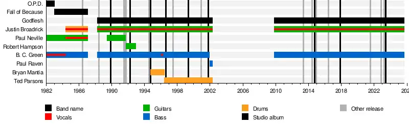 The band that would eventually become Godflesh, O.P.D. (Officially Pronounced Dead),[1][2] formed in 1982 when B. C. Green and Paul Neville, two young musicians living in cheap council estate housing in east Birmingham, started experimenting musically alongside a drum machine.[3][4] In 1983, the band renamed to Fall of Because, named after a Killing Joke song and a chapter from an Aleister Crowley book.[5] The band found a live drummer, Justin Broadrick, who lived in the same council housing as Green and Neville. Broadrick joined the group in 1984 after organising a concert at The Mermaid in Birmingham.[4][5] At that show, Fall of Because, Final (Broadrick's first musical act), and an early incarnation of Napalm Death performed before a crowd of twenty-five people.[5] In the months following that concert, Broadrick joined Napalm Death as a guitarist and Fall of Because as a drummer and altered the latter's sound by introducing albums from Swans, Sonic Youth and Discharge to Green and Neville.[4][5] Only fifteen at the time, Broadrick said he "usurped" their band.[5]