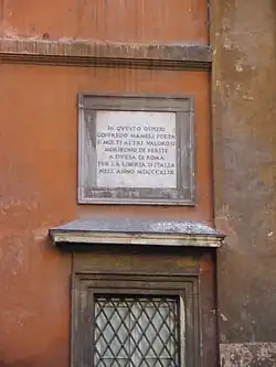 During the siege of Rome, he was an aide of Giuseppe Garibaldi, who fought in Palestrina (9 May) and in Velletri (19 May).[2] In particular he fought in the defense of the Villa del Vascello on the Janiculum hill. He was wounded in the left leg by the French during the last assault of 3 June at Villa Corsini, occupied by the French.[2]