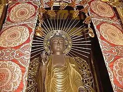 Gohonzon (御本尊) is a generic term for a venerated religious object in Japanese Buddhism. It may take the form of a scroll or statuary. The term gohonzon typically refers to the mainstream use of venerated objects within Nichiren Buddhism, referring to the calligraphic paper mandala inscribed by the 13th Japanese Buddhist priest Nichiren to which devotional chanting is directed.[2][3][4]