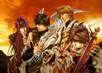 The protagonists of the Saiyuki series, (from left to right) Sha Gojyo, Cho Hakkai, Genjo Sanzo and Son Goku.