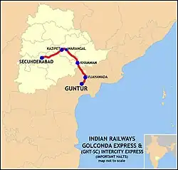 The 17201 / 17202 Golconda Express is an intercity express train running between Secunderabad and Guntur.[1] It is provided with stoppage at Pedakakani railway station with effect from 1 May 2011.