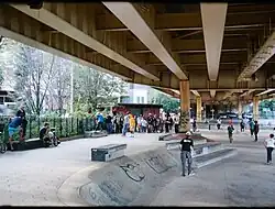 Golconda Skate Park, known as Fat Kid, is a public skate park in the Downtown Brooklyn/Fort Greene neighborhoods of Brooklyn, New York City, that originated as a DIY skate spot.[1][2] Built under the Brooklyn Queens Expressway, the 18,000 square foot professionally built skate park was completed in 2016 and sits within Golconda Playground.[3][2]