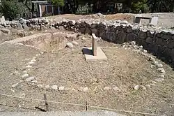 Heinrich Schliemann, a German archaeologist, excavated Mycenae in 1876. Of the six shaft graves in Grave Circle A, the "Mask of Agamemnon" was found in Grave V. In addition, six of the men found in the shafts of Grave Circle A were given gold masks, and then one child who was also found with a suit of gold had a gold mask.[2] There were 7 skulls found in Grave Circle B that, when facially reconstructed, had several similarities between them that led scholars to believe the faces were related.[4] This suggest that there were different families buried in Grave Circle A, and that each wanted to boast their wealth and success over the other family. To make these masks they took crude gold and beat them into the shapes they wanted using a technique called repoussé. The gold vessels found, mostly cups, were clear examples of status symbols. The craftsmen of the gold vessels also used repoussé, which would require more work than a regular vessel. There was one specific gold cup found in Grave Circle A that resembles Nestor's Cup from Homer's Iliad.[5] Even in death, families used gold for conspicuous displays of wealth.