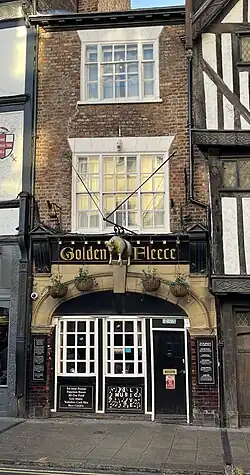 The Golden Fleece was originally built as a coaching house.[3] The inn is mentioned in the York City Archives as far back as 1503, when it was owned by the Merchant Adventurers' Hall.[4][5] The building derives it name from it's dealings with local wool traders. From 1656, it began operating as an inn, however it was not officially licensed until 1668.[5][6]