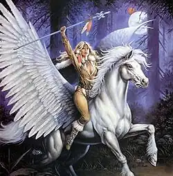![]() Goldmoon riding a pegasus on her way to Xak Tsaroth. Illustration by Clyde Caldwell. | |