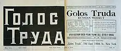 Golos Truda (Russian: Голос Труда, lit. 'The Voice of Labour') was a Russian-language anarchist newspaper.[1] Founded by working-class Russian expatriates in New York City in 1911,[2] Golos Truda shifted to Petrograd during the Russian Revolution in 1917, when its editors took advantage of the general amnesty and right of return for political dissidents. There, the paper integrated itself into the anarchist labour movement, pronounced the necessity of a social revolution of and by the workers, and situated itself in opposition to the myriad of other left-wing movements.