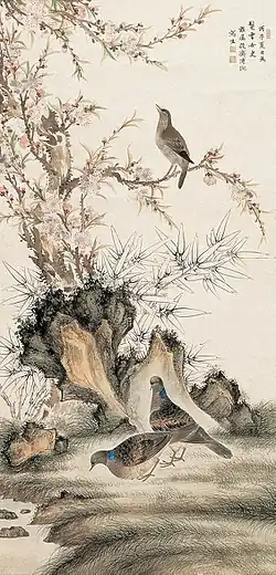 The name is from the Chinese gong jin meaning 'tidy' (meticulous brush craftsmanship). The gongbi technique uses highly detailed brushstrokes that delimits details very precisely and without independent or expressive variation.[1] It is often highly colored and usually depicts figural or narrative subjects.[2]