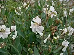 Goodenia albiflora, commonly known as white goodenia,[2] is a species of flowering plant in the family Goodeniaceae and endemic to South Australia. It is a small, erect shrub with ridged stems, elliptic to egg-shaped, cauline leaves, racemes of white flowers with leaf-like bracteoles at the base, and oval fruit.