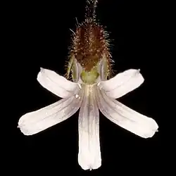 Goodenia cycnopotamica is an annual herb. The flower stalks are up to 25 cm long. Leaves oblong to oblanceolate, dentate to lyrate; lamina 2-6 cm long, 3-10 mm wide. The bracteoles are up to 15 mm long, and free. The sepals are free or nearly free, about 4 mm long, and are oblong to elliptic,[2] and attached below the ovary.[3] The pink, lilac to white corolla is 5 to 6 mm long, and hairy to almost smooth on the outside, while the inside is sometimes glabrous and sometimes not. There are no projections. The ovary has about four ovules. The capsule is globular. The seeds are wrinkled and 3 to 4 mm in diameter,[2] with a comma-shaped body and broad wings.[4] It flowers mainly from August to October.[2]