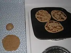 A gordita (Spanish pronunciation: [ɡoɾˈðita]; lit. 'chubby') in Mexican cuisine is a dish made with masa and stuffed with cheese, meat, or other fillings.[1] It is similar to the Colombian and Venezuelan arepa. There are two main variations of this dish, one of which is typically fried in a deep wok-shaped comal, consumed mostly in central and southern Mexico, and another one baked on a regular comal. The most common and representative variation of this dish is the "gordita de chicharrón", filled with chicharron (a spiced stew of pork rind) which is widely consumed throughout Mexico. Gorditas are often eaten as a lunch dish and accompanied by several types of sauce.