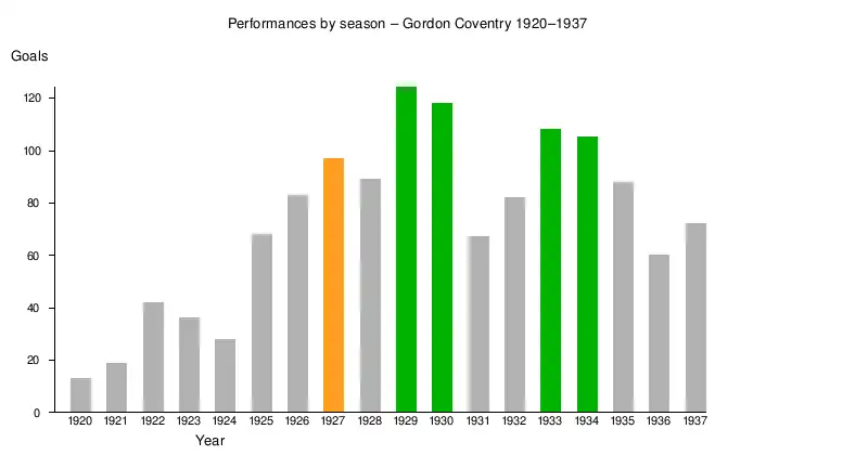 He was the first player to kick 100 goals in a VFL season (which he did in 1929, 1930, 1933, and 1934), and he kicked a total of 1299 goals in VFL football: a record that stood for more than six decades until it was broken by Sydney Swans player Tony Lockett in the match against Coventry's former club, Collingwood, on 6 June 1999.