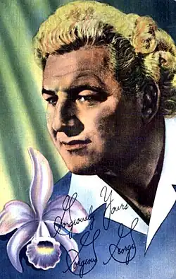 In one of his final matches, Gorgeous George later faced off against, and lost to, an up-and-coming Bruno Sammartino.[29] He lost his precious hair again, when he was defeated by the Destroyer in a hair vs. mask match at the Olympic Auditorium on November 7, 1962.[11] This was his final match, as he was nearly 50 years old and suffering from the effects of alcoholism.[30] Gorgeous George appeared in one motion picture, Alias the Champ, made in 1949, which featured wrestler Tor Johnson.[31]
