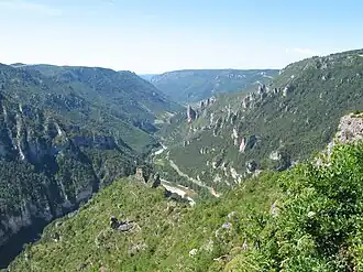 The Gorges du Tarn (Occitan: Gòrjas de Tarn) is a canyon formed by the Tarn (river) between the Causse Méjean and the Causse de Sauveterre, in southern France. The canyon, mainly located in the Lozère département, and partially in the Aveyron département, is about 53 kilometres (33 mi)-long (from the village of Quézac to Le Rozier, from 44°22′30″N 3°31′15″E / 44.37500°N 3.52083°E to 44°11′36″N 3°12′20″E / 44.19333°N 3.20556°E) and 400 m to 600 m deep.