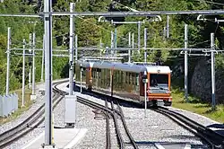 The line is 9,339 m (30,640 ft) in length, including 3,790 m (12,434 ft) of double track, and traverses an altitude difference of 1,469 m (4,820 ft). It is built to metre gauge (3 ft 3+3⁄8 in) and uses the Abt rack system throughout. It is one of four lines in the world using three-phase electric power, requiring two overhead conductors, with the track forming the third conductor.[1][2] There is a non-powered connection with the metre gauge Matterhorn Gotthard Bahn at Zermatt to allow transfer of freight and delivery of rolling stock.
