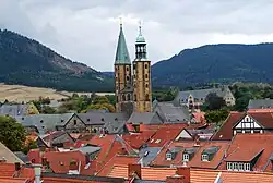 Goslar (German pronunciation: [ˈɡɔslaʁ] ⓘ; Eastphalian: Goslär) is a historic town in Lower Saxony, Germany. It is the administrative centre of the district of Goslar and is located on the northwestern slopes of the Harz mountain range. The Old Town of Goslar with over 1.500[3] timber houses and the Mines of Rammelsberg are UNESCO World Heritage Sites for their millennium-long testimony to the history of ore mining and their political importance for the Holy Roman Empire and Hanseatic League.[4] Each year Goslar awards the Kaiserring to an international artist, called the "Nobel Prize" of the art world.[5]