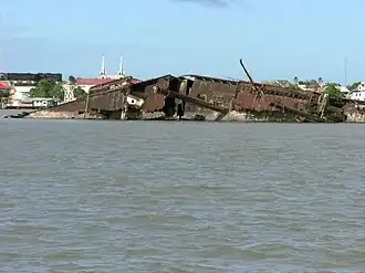 Goslar is a partly-submerged shipwreck in the Suriname River in Paramaribo, Suriname. It is the remains of a Norddeutscher Lloyd (NDL) steam turbine cargo ship that was built in 1929. When the Second World War began in 1939, she sought refuge in Surinam, which was then a Dutch colony. When Germany invaded the Netherlands in 1940, her crew scuttled her.