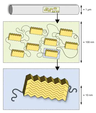 Silks have a hierarchical structure. The primary structure is the amino acid sequence of its proteins (spidroin), mainly consisting of highly repetitive glycine and alanine blocks,[4][5] which is why silks are often referred to as a block co-polymer. On a secondary level, the short side-chained alanine is mainly found in the crystalline domains (beta sheets) of the nanofibril. Glycine is mostly found in the so-called amorphous matrix consisting of helical and beta turn structures.[5][6] The interplay between the hard crystalline segments and the strained elastic semi-amorphous regions gives spider silk its extraordinary properties.[7][8] Various compounds other than protein are used to enhance the fibre's properties. Pyrrolidine has hygroscopic properties that keep the silk moist while warding off ant invasion. It occurs in high concentration in glue threads. Potassium hydrogen phosphate releases hydrogen ions in aqueous solution, resulting in a pH of about 4, making the silk acidic and thus protecting it from fungi and bacteria that would otherwise digest the protein. Potassium nitrate is believed to prevent the protein from denaturing in the acidic milieu.[9]