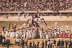 Gossaum (Korean: 고싸움) is a traditional Korean sport played in Chilseok village, Nam-gu as part of the New Year's celebrations. It is designated an Important Intangible Cultural Property.[1] It is played by two teams, each of which carries a Go, a large, braided straw structure. The objective is for one team to drive the other's Go to the ground.[2] The name is derived from "go" ("loop", literally, the looped knot of a coat string) and "sseum" ("fight").[3] In 2002 the game was commemorated on a postage stamp.[4]