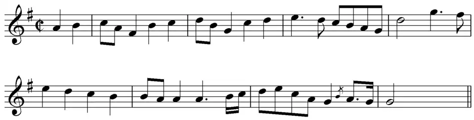 ![\new Staff << \clef treble \key g \major { \time 4/4 \partial 2 \relative g' { \set Staff.midiInstrument = #"clarinet" \repeat unfold 2 { g4. a8 | b4 a c b | a8 (fis) g4 e' d | c b a b8 (g) | d'2 \bar "|" \break } a4 b | a8 (fis) d4 c' b | a8 (fis) d4 d' c | b4. b8 cis4 cis8 (d) | d2 \bar "|" \break \repeat volta 2 { g4. fis8 | fis8 ([ e8 ]) d4 e4. d8 | d8 ([ c8 ]) b4 a4. b16 (c) | d8 ([e]) c ([a]) g4 \appoggiatura b8 a8 (g) | g2 } } } \new Lyrics \lyricmode { Gott4. er8 -- hal4 -- te Franz den Kai -- ser, Un -- sern gu -- ten Kai -- ser Franz!2 Lang4. -- e8 le4 -- be Franz der Kai -- ser, In des Glück -- es hell -- stem Glanz!2 Ihm4 er -- blü -- hen Lor -- beer -- rei -- ser, Wo er geht,4. zum8 Eh4 -- ren -- kranz!2 Gott4. er8 -- hal4 -- te Franz4. den8 Kai4 -- ser, Un4. -- sern8 gu4 -- ten Kai -- ser Franz!2 } >> \layout { indent = #0 } \midi { \tempo 4 = 90 }](./_assets_/b85c92fd1e23b30bfe83bab956a01ced.png)