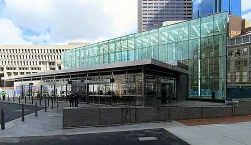 Scollay Square station opened as part of the third phase of the Tremont Street Subway in September 1898, bringing subway service to the area with a stone headhouse in the center of the square. Court Street station opened on the East Boston Tunnel in December 1904; it was closed in 1914 and replaced by a lower level (Scollay Under) to the Scollay Square station in 1916.[32] The station was rebuilt in 1963 as Government Center station with a low brick headhouse, and again from 2014 to 2016 with a large glass headhouse that dominates the south side of the plaza.[33] It serves as the transfer point between the MBTA's Blue and Green Lines.