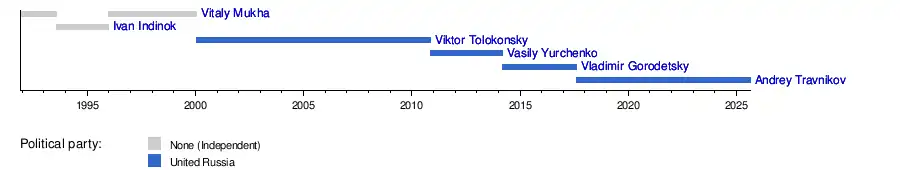 Andrey Travnikov, representing "United Russia" party, was nominated as Governor by President Vladimir Putin on 6 October 2017, replacing Vladimir Gorodetsky.
