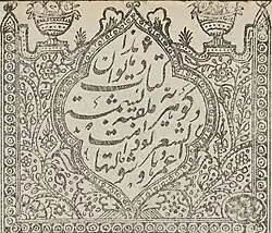 In the preface of her poetry collection, which was published in Isfahan in 1902 (1320 AH) with the support of Ahmad Fateh al-Molk,[11] it is mentioned that Malek Jahan Khanom, the mother of Naser al-Din Shah, requested her to compose a poem in praise of Fatimah and to recite it at a gathering held for that occasion.[12] Her success, described in the text as eloquence and fluency, led to her fame, and Naser al-Din Shah bestowed upon her the title "Shams al-Shu'ara" (Sun of the Poets).[12][5]
