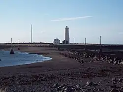 Grótta (pronounced [ˈkrouhta]) is a tied island at the extreme end of Seltjarnarnes in the Capital Region of Iceland. During high tide the tombolo is completely submerged, turning Grótta into an island.[1]